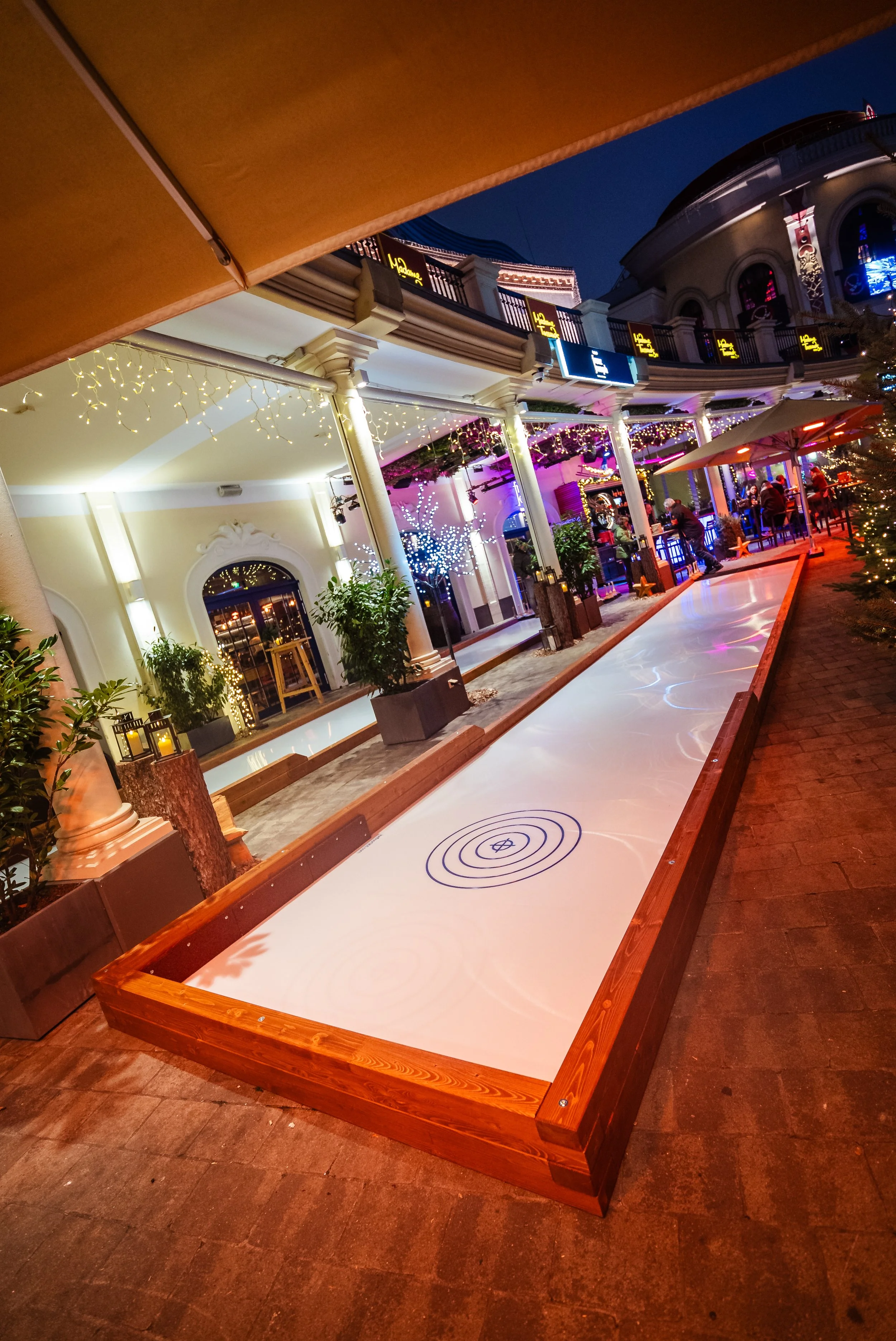 Seit diesem Winter verwandelt sich unsere Terrasse in eine stimmungsvolle Winterlandschaft. Zwischen Tannenbäumen und Lichterketten könnt ihr jetzt beim Eisstockschiessen mitten im Prater euer Können unter Beweis stellen.